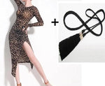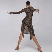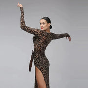 Leopard Print Midi Dress with High Split Long Sleeve for Latin, Tango, Samba, Dance, and Parties